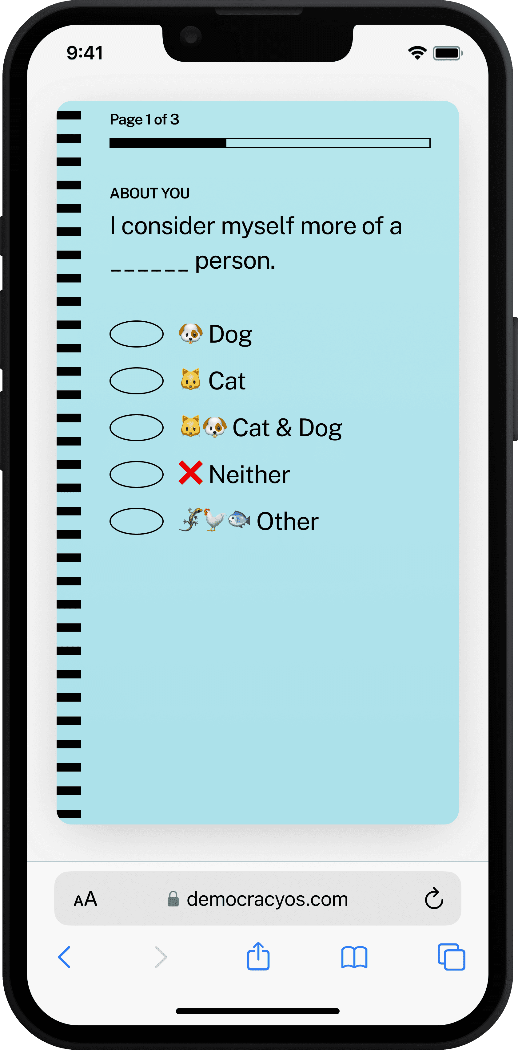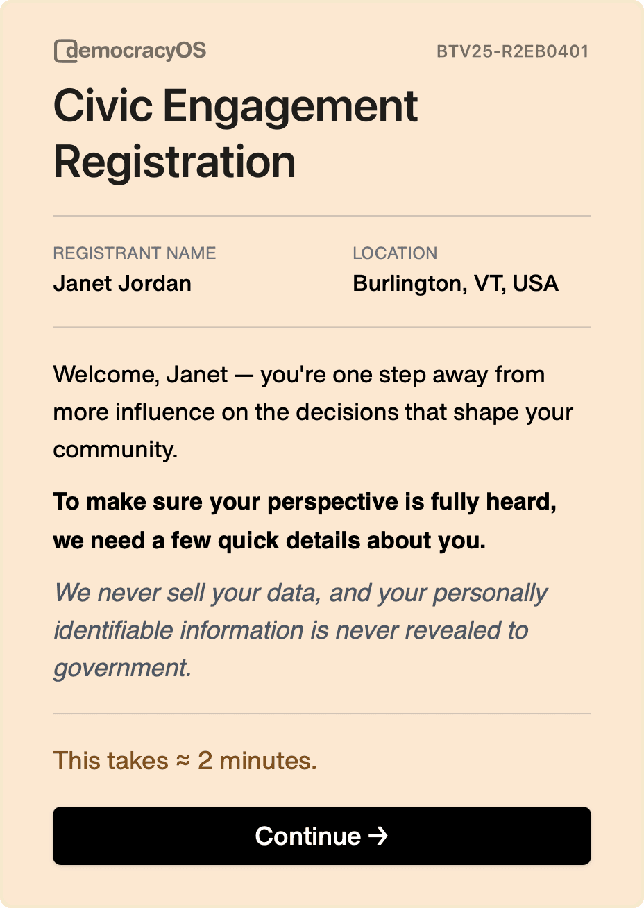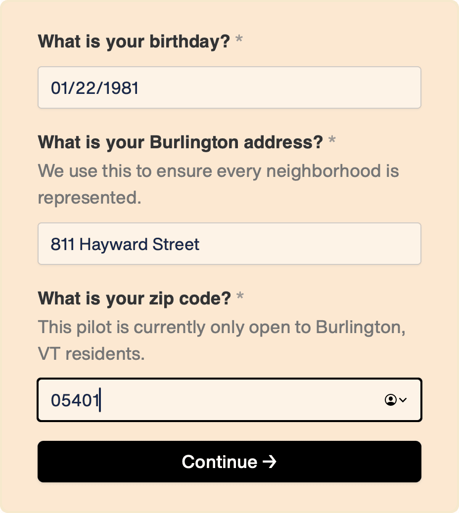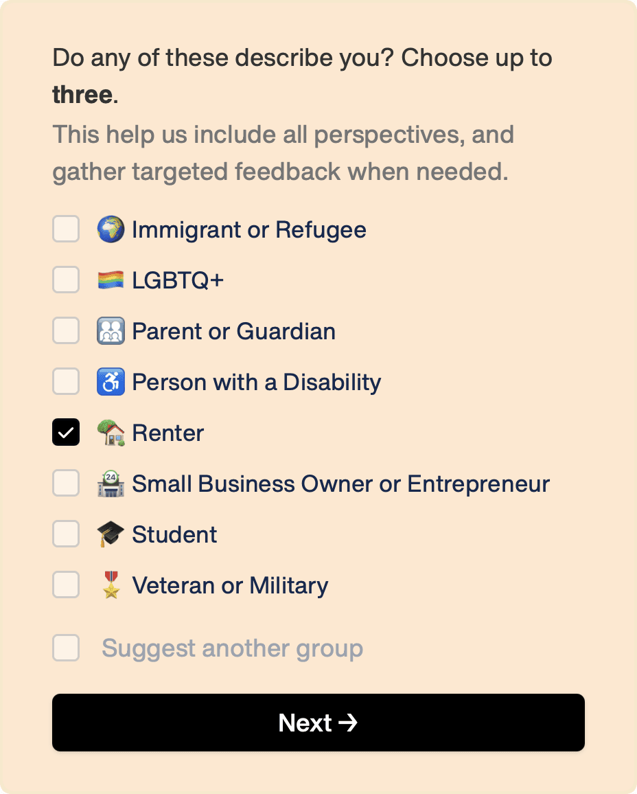 After the user shares the basic contact information and opts-in to contact (giving us the ability to follow up with drop-offs), they're guided to a demographic onboarding flow. This is where they provide the minimum details necessary to allow us to select stratified, random samples of the public — critical to ensuring greater accuracy of insight.