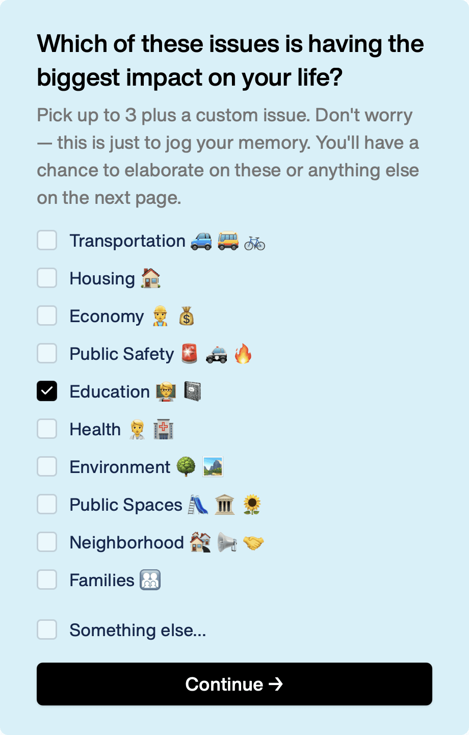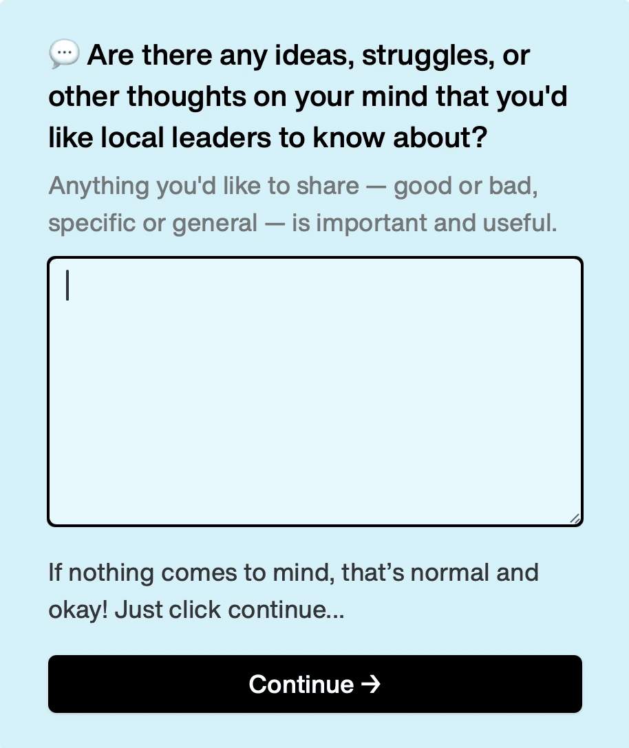 At first I thought a single, well-written, open-ended question could prompt users to think deeply and share the issues on their minds. Analyzed at scale, this data could give us a broad sense of public sentiment.