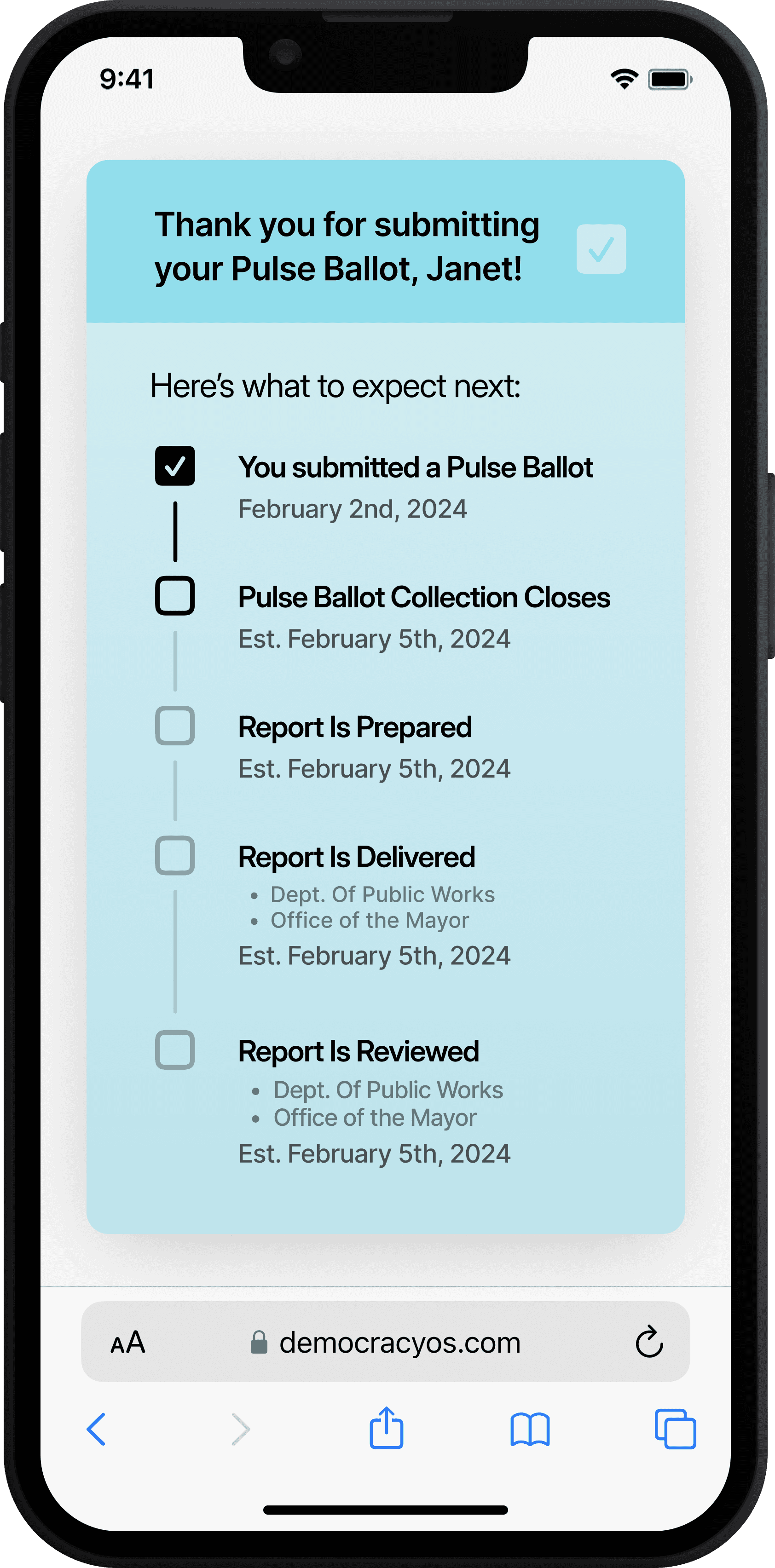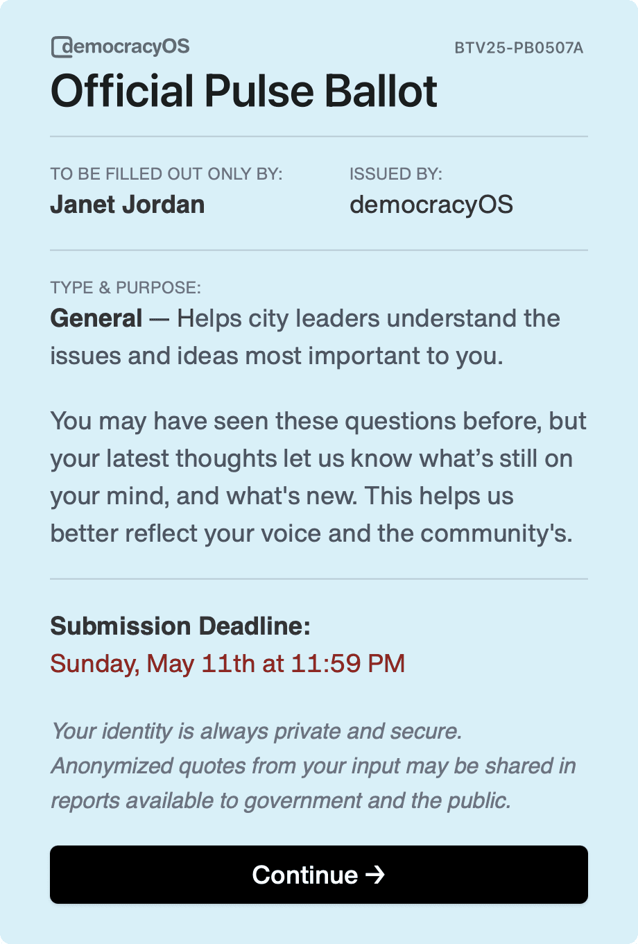 After a Pulse Ballot closes, participants are told exactly how and when their input will be used, and who will review it. This is a crucial step that contributes to peoples' sense that their input does matter.