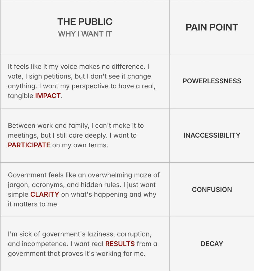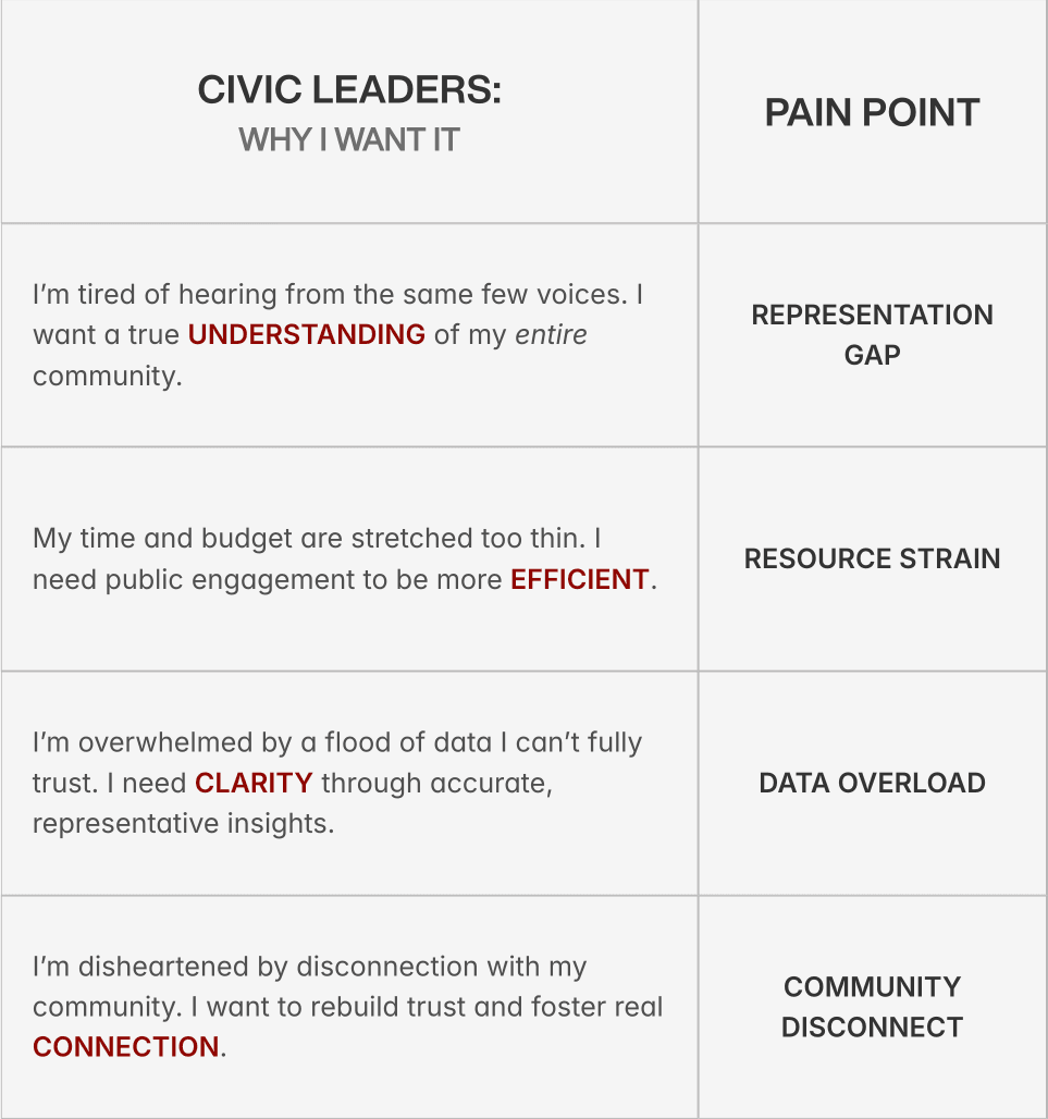 Distilled those insights into clear pain points: 4 for civic leaders, and 4 for public users.