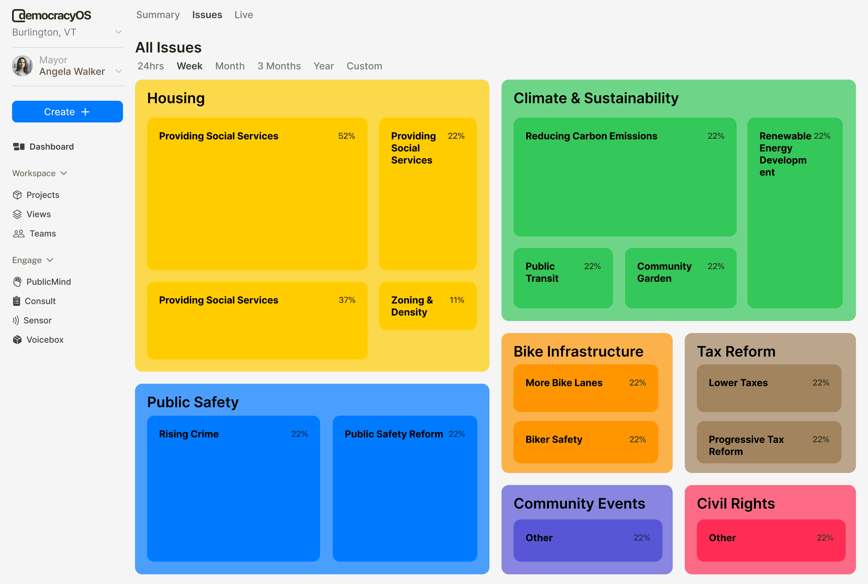 I wanted DemocracyOS to replace that guesswork with clarity. The platform provides a real-time, data-driven map of public priorities — a visual snapshot of community mindshare across key issues — all possible with Pulse Ballots and random, representative sampling.
