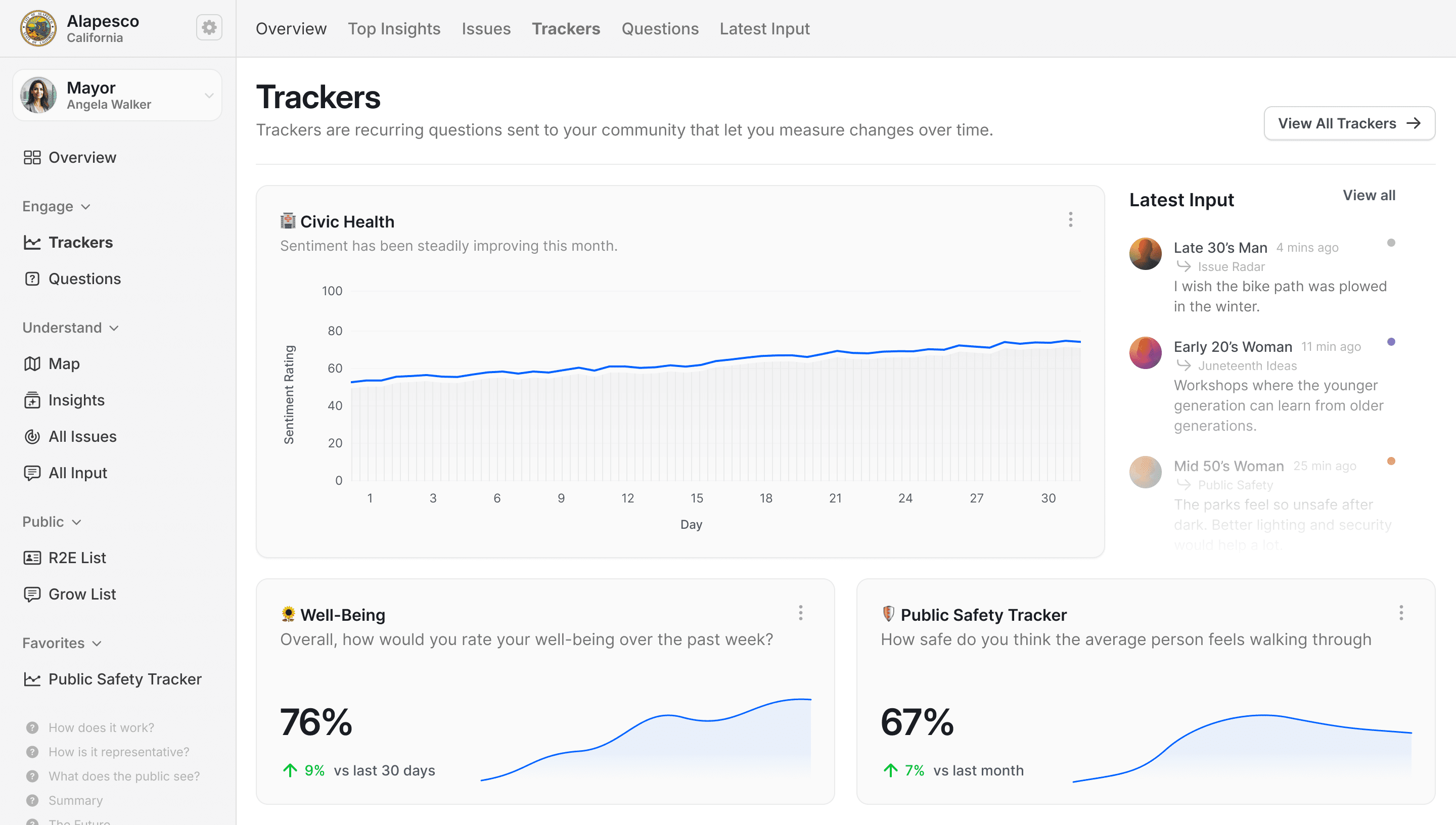 By tracking aggregated sentiment data we could display a "Civic Health" score, giving leaders a contextual sense of the community's overall mood and how it's trending.