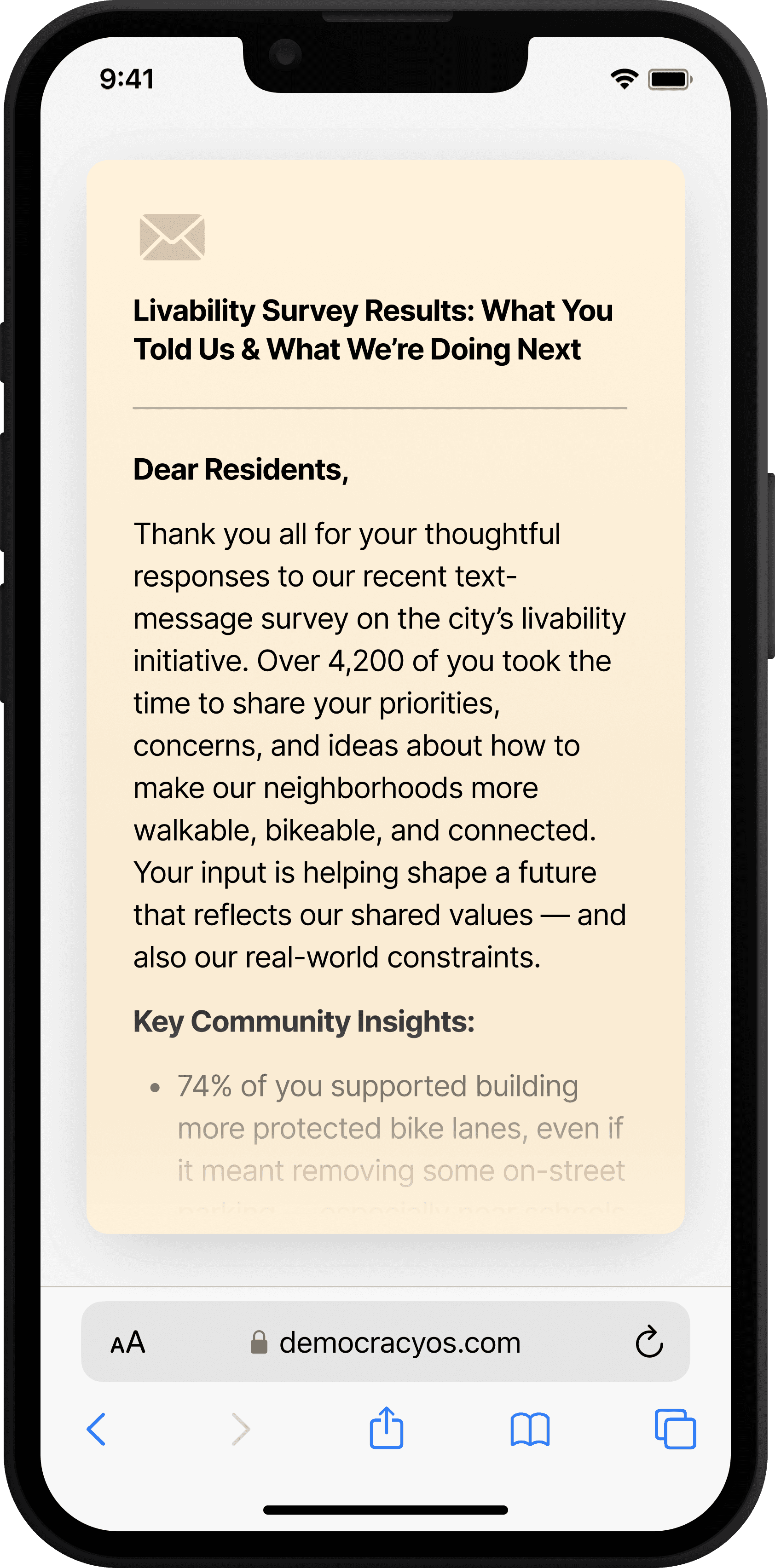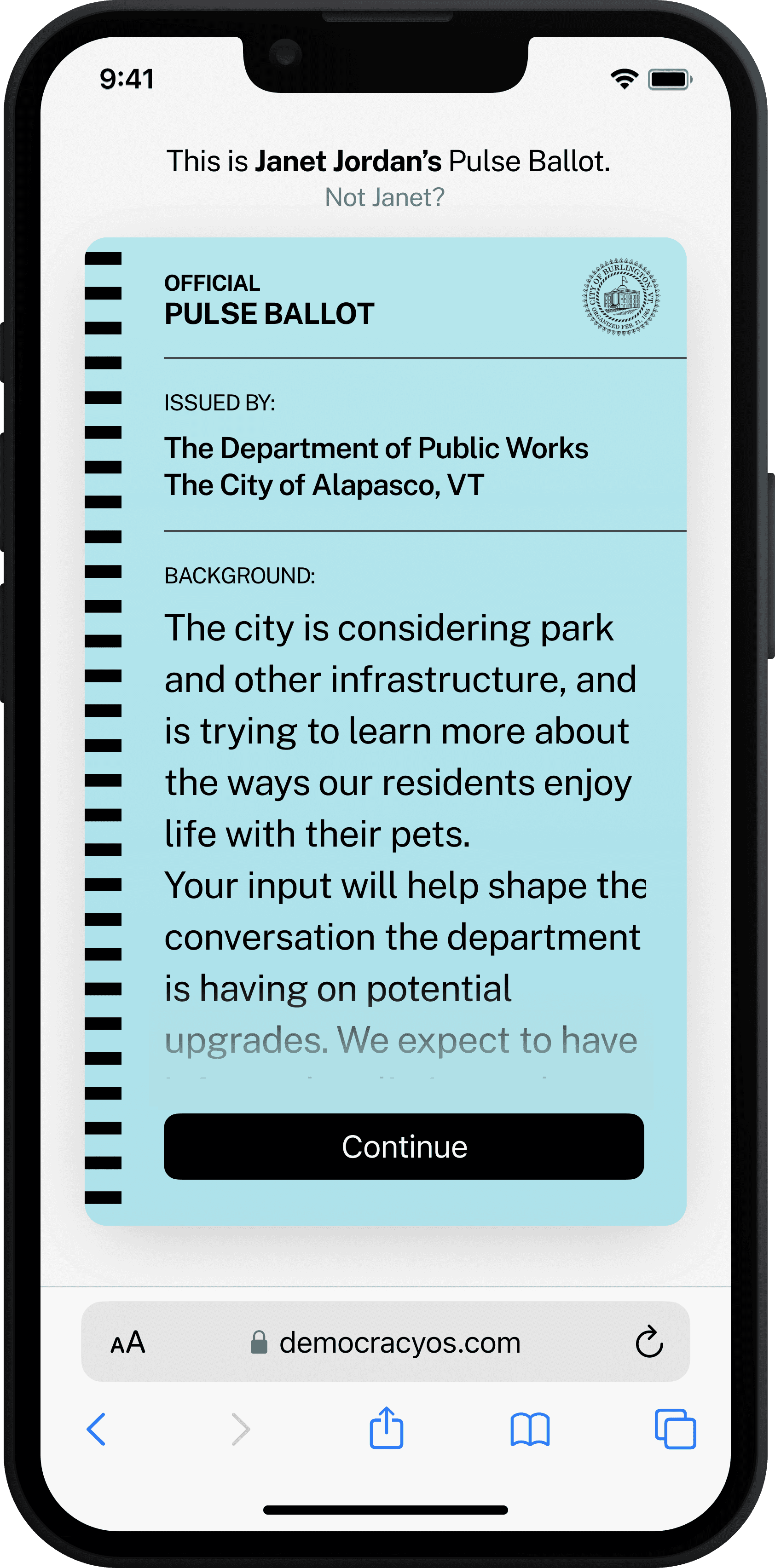 Friction-free SMS “Pulse Ballots” let residents share rich feedback in under a minute.