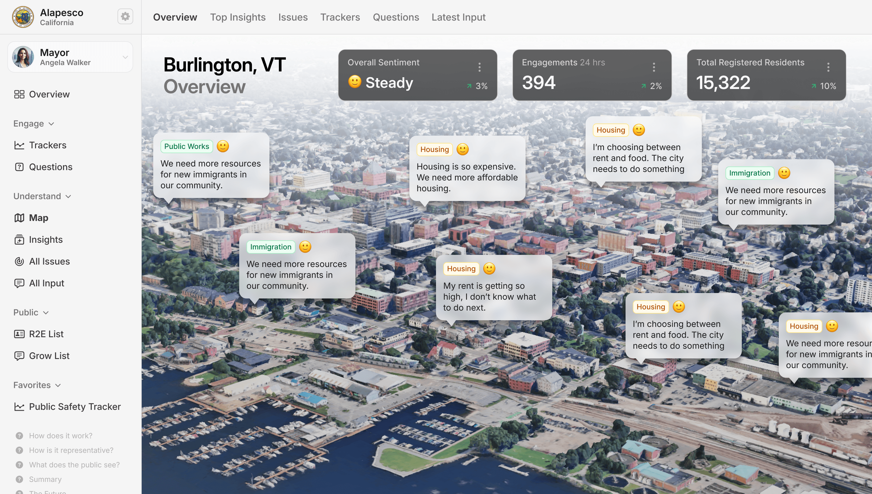 I identified governments as the most viable customer: they face real challenges and are equipped with the resources to solve them. With this in mind, I designed the government experience to deliver deep insight into public priorities and sentiment, enabling smarter decisions while building trust and participation that benefit everyone.